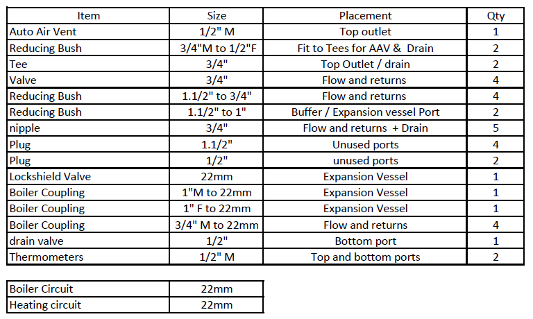 A complete pre-packed kit with all the required parts to fit a PSM buffer tank for boiler circuit 22mm and heating circuit 22mm.